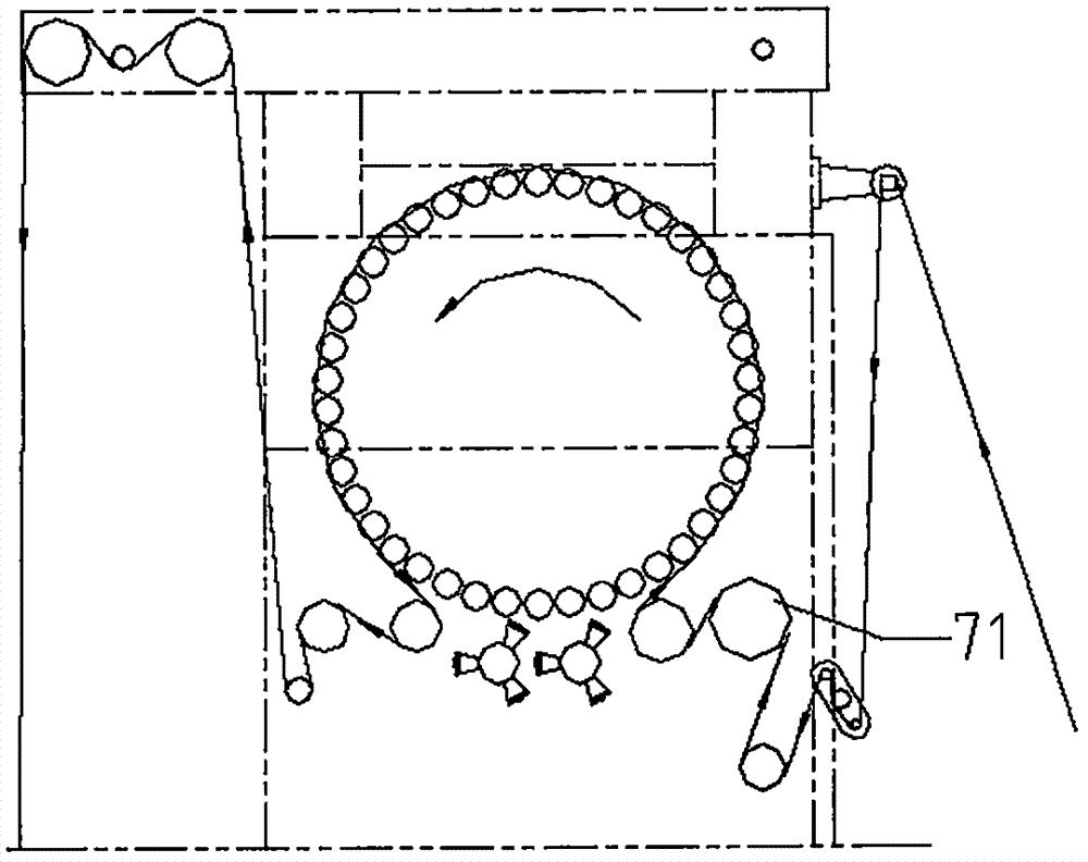 工作時(shí),織物先經(jīng)進(jìn)布機(jī)構(gòu)2或烘布機(jī)構(gòu)7,在進(jìn)布桿21的牽引下,依次繞過張力架22、制動(dòng)輥23、擴(kuò)幅輥24、光輥25或依次繞過張力架22、制動(dòng)輥23、烘布輥71,在前導(dǎo)布輥26上繞行后,經(jīng)過繞在錫林31上的42個(gè)針輥32,在織物表面均勻的覆蓋一層絨毛,使得相鄰絨毛交織設(shè)置,起毛效果好,絨面蓬松,提高了起毛效率;位于錫林31正下方的毛刷輥33起到了清理絨毛的作用;然后繞過后導(dǎo)布輥43、緊導(dǎo)輥41、過布輥42,在經(jīng)過出布機(jī)構(gòu)5,完成整道工序。其中進(jìn)布裝置有兩種方式:擴(kuò)幅輥24適合用于針織布,烘布輥71適合用于梭織布。